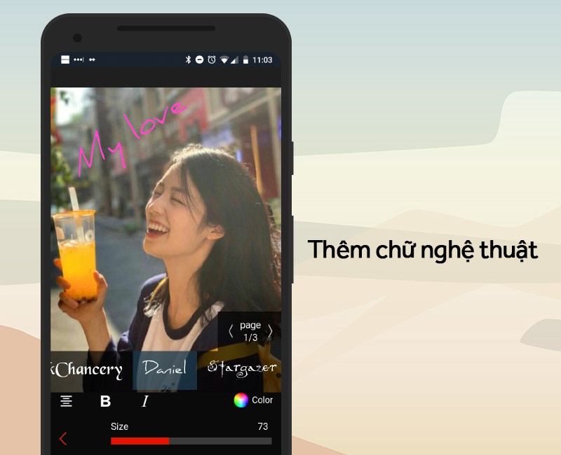 Với ứng dụng Fantasia Painter Free, bạn cũng có thể thêm chữ vào ảnh với nhiều phông chữ cực kỳ đẹp như Daniel, Stargazer,... đồng thời bạn cũng có thể di chuyển, thay đổi màu sắc, kích thước,... của chữ một cách dễ dàng, giúp bạn có được một bức ảnh đậm chất riêng với những dòng chữ nghệ thuật độc đáo.