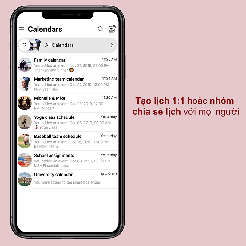 Mỗi ngày, bạn có thể kiểm tra lịch công việc và sự kiện của mình trên ứng dụng GroupCal - Lịch được chia sẻ. Tất cả các sự kiện từ lịch bạn tạo, lịch được người khác chia sẻ và từ các tài khoản lịch trên mọi thiết bị của bạn như: Google, iCloud, Exchange,...