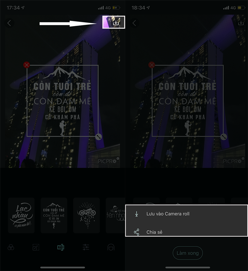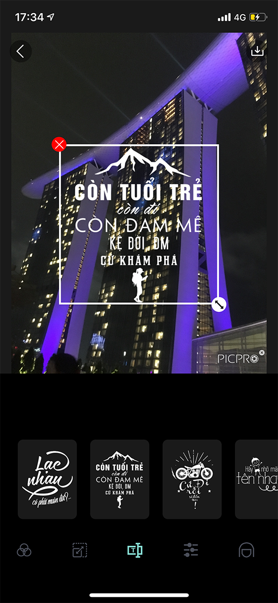 Mở ứng dụng PicPro > Chọn ảnh cần chèn > Chọn sticker chữ yêu thích > Bấm lưu > Hoàn tất quá trình.