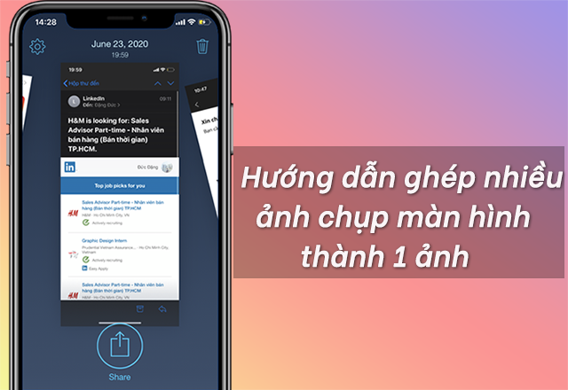 Chụp các ảnh màn hình > Mở ứng dụng Tailor > Ảnh màn hình được ghép sẽ hiển thị > Chọn Share.