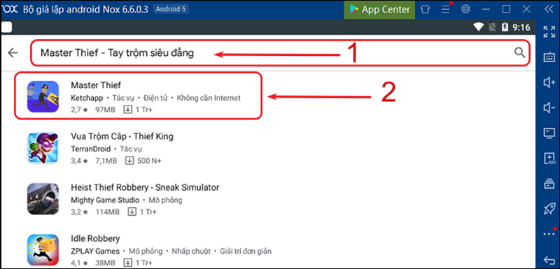Bước 5: Khởi động Nox > Nhấp đúp chuột vào biểu tượng của Google Play> Nhập Master Thief ở thanh tìm kiếm > Chọn vào tên ứng dụng