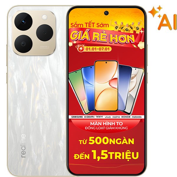 Hạ phân khúc xuống 1 bậc thì các sản phẩm realme C sẽ là các mẫu máy thuộc phân khúc tầm trung với mức giá dao động từ 5 đến 7 triệu đồng. Mẫu máy mới nhất của dòng này là realme C75 với 3 màu sắc khác nhau và có đến 3 phiên bản dung lượng bộ nhớ từ 128GB, 256GB và 512GB. Máy cũng có khả năng kháng nước lên đến IP69 giúp bạn sử dụng thoải mái kể cả có mưa lớn đi chăng nữa.