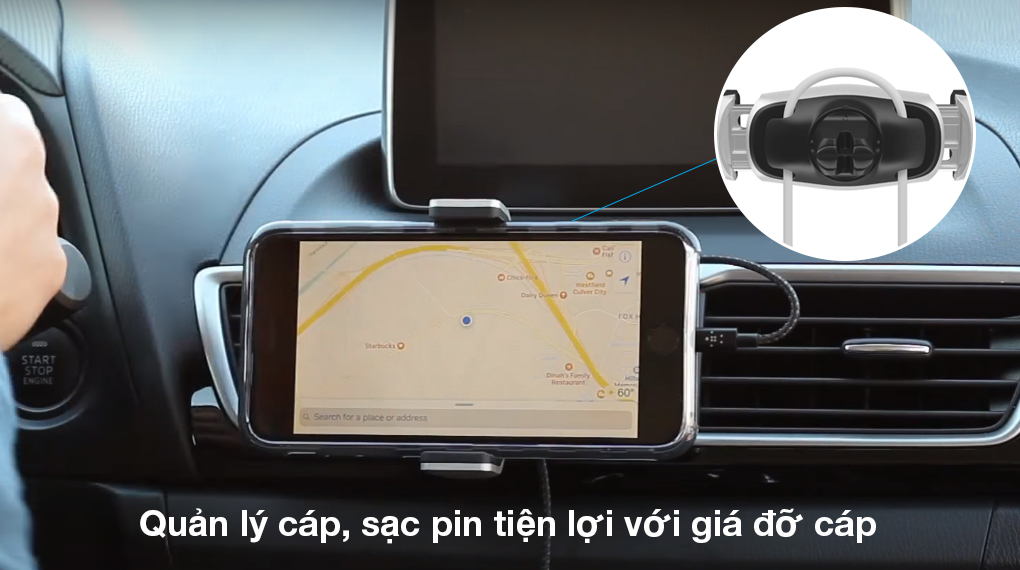Khu vực bảng điều khiển ô tô rất quan trọng, nếu để dây cáp vướng víu có thể sẽ gây ra nhiều trở ngại cho bạn khi lái xe nên Belkin đã tích hợp 1 giá đỡ cáp nằm ở mặt lưng của đế điện thoại xe hơi Belkin, người dùng có thể luồn dây cáp qua giá đỡ và cắm sạc tiện lợi bất cứ khi nào mình cần.
