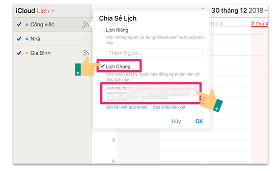 Bạn vào iCloud.com và đăng nhập > Lịch > bên phía tay trái chọn vào biểu tượng Wi-Fi rồi tick vào Lịch chung. Trong phần Webcal chính là thông tin URL cho bạn chia sẻ, lúc này bạn copy URL này và gửi qua mail và có mở trên nhiều thiết bị khi cần thiết.