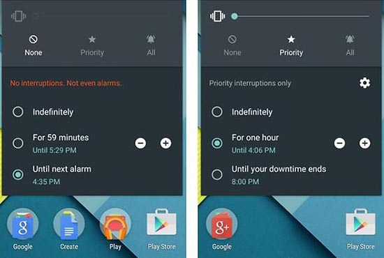 Nút điều khiển âm lượng (volume) trên Android 5.1 có thêm biểu tượng cho các chế độ (None, Priority, All).
