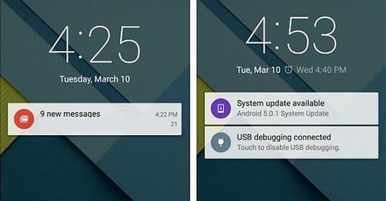 Ở phiên bản Android 5.1, khi đang mở bảng thông báo trên màn hình khóa, người dùng muốn mở khóa máy chỉ cần vuốt vào phần bên ngoài bảng thông báo. Nghĩa là bạn sẽ có thêm một cách truy cập vào màn hình chủ. Trước kia, nếu máy đang ở trạng thái khóa, bạn vuốt xuống để mở màn hình cài đặt nhanh sau đó vuốt lên để đóng màn hình này, bạn vẫn sẽ trở về màn hình khóa máy.