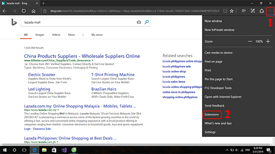 Bước 1: Bạn truy cập vào trình duyệt Microsoft Edge. Tại đây, bạn chọn biểu tượng More (1) >> Extensions (2).