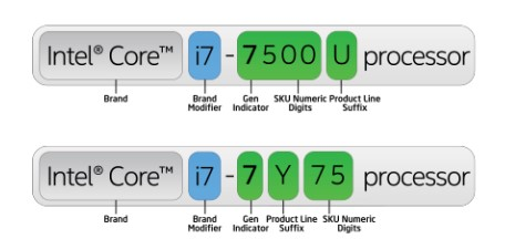 Số hiệu bộ xử lý cho các bộ xử lý Intel® Core™ thế hệ thứ 7 sử dụng một chuỗi chữ và số dựa trên thế hệ và dòng sản phẩm theo nhãn hiệu và bộ điều chỉnh của nó. Chữ số đầu tiên trong chuỗi bốn chữ số cho biết thế hệ của bộ xử lý, còn ba chữ số tiếp theo là mã SKU. Khi có thể áp dụng, hậu tố chữ cái sẽ xuất hiện ở cuối tên bộ xử lý đại diện cho dòng bộ xử lý. Bộ xử lý Máy tính bàn cao cấp của Intel® tuân theo một hệ thống đánh số khác do sự khác nhau trong bộ tính năng của chúng.