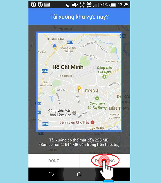 Cuối cùng ngồi đợi cho nó tải xong vậy là bạn đã lưu lại trong hệ thống, khi cần dùng bạn có thể mở ra để xem đường đi hoặc chỉ dẫn ngay cả khi không có mạng internet trên thiết bị di động của bạn.