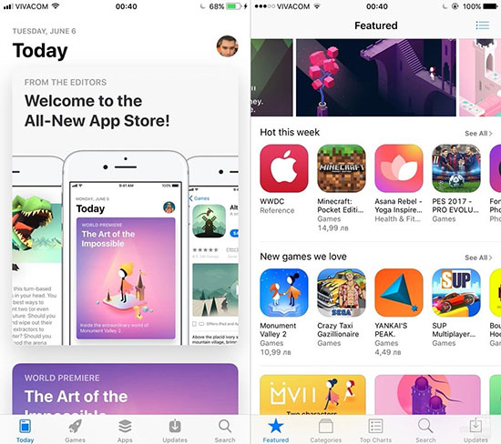 4. AppStore cũng được Apple làm mới với hình ảnh, nội dung của ứng dụng được hiển thị to rõ, dễ nhìn hơn. Ngoài ra, hãng cũng thêm vào mục "Ứng dụng của ngày" (Today) hiển thị các phần mềm nổi bật, tiêu biểu.