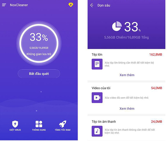 Tính năng này tìm ra các tệp rác như: bộ nhớ đệm cache, tệp tải về, tệp tạm thời, tệp lịch sử, sau đó đề xuất dọn dẹp để giải phóng bộ nhớ cho điện thoại. Ngoài ra, Nox Cleaner còn tích hợp tính năng dọn dẹp chuyên dụng dành cho các ứng dụng mạng xã hội.