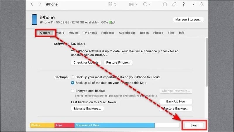 Bước 4: Để đồng bộ hóa dữ liệu giữa hai máy từ iPhone qua MacBook, nhấn vào General > Bấm chọn Sync ở góc bên phải phía dưới màn hình MacBook.