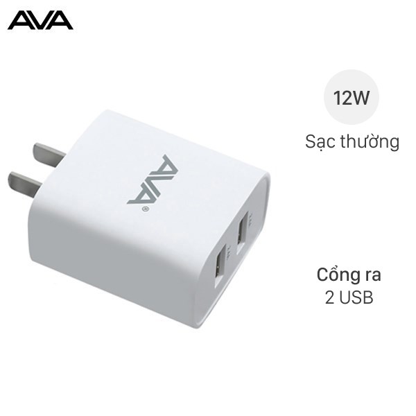 Adapter sạc AVA màu trắng sáng thời trang, nhỏ gọn, không chiếm chỗ nên rất tiện mang theo, tiện lợi nhờ hai cổng sạc song song cho hai thiết bị.