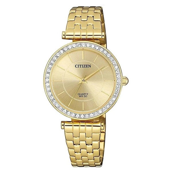 Đồng hồ CITIZEN 30 mm Nữ ER0212-50P mang một thiết kế sang trọng, sành điệu đầy nữ tính với các hạt lấp lánh đính vòng tròn xung quanh mặt đồng hồ.