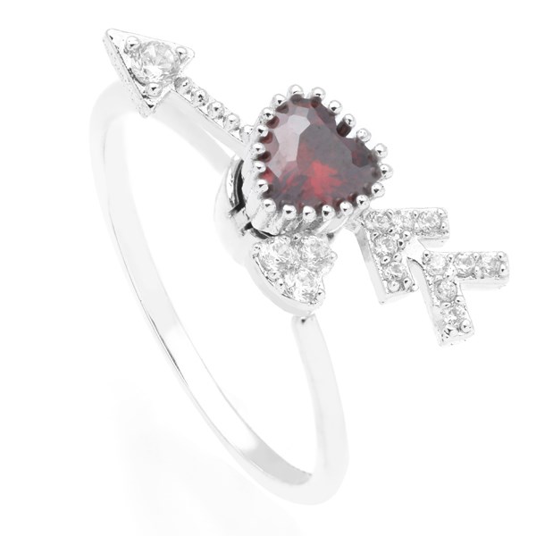 Phần mặt nhẫn gồm một trái tim được làm từ đá quý màu đỏ rực rỡ, được xuyên qua bởi một mũi tên đính đá màu trắng - biểu tượng quen thuộc của tình yêu. Đây sẽ là thiết kế phù hợp với những bạn nữ có tính cách dịu dàng, nữ tính và thích lãng mạn.