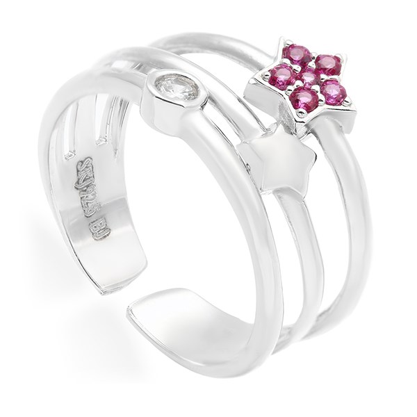 Nhẫn AvaJi AVJ.R000430 có vòng nhẫn gồm 3 lớp, mỗi lớp được đính một kiểu mặt khác nhau gồm mặt tròn, mặt ngôi sao trơn và mặt ngôi sao đính đá hồng.