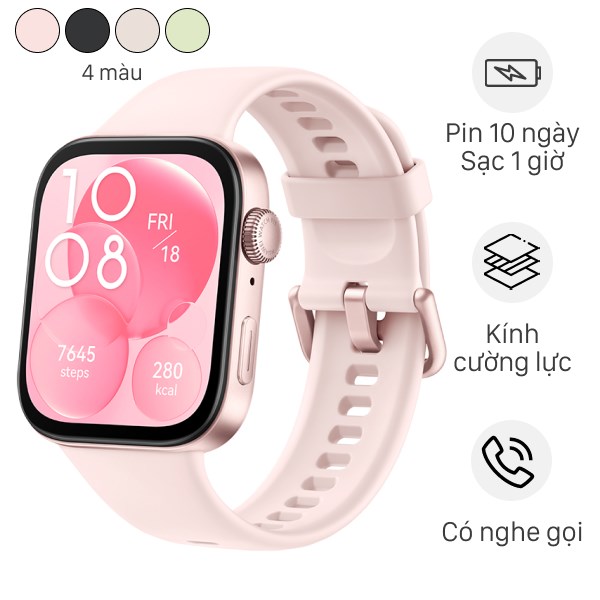 Huawei Watch Fit 3 là smartwatch thiết kế thời thượng, gọn nhẹ (26g), khung viền nhôm, mặt kính cường lực. Màn hình AMOLED 1.82 inch, độ phân giải 480x408 pixels, hiển thị sắc nét, sống động, hỗ trợ Always-on Display, nhiều mặt đồng hồ tùy biến. Hai nút vật lý, nút xoay điều khiển tiện lợi. Kết nối Bluetooth 5.2 với Android và iOS qua Huawei Health, nghe gọi Bluetooth, nhận thông báo tin nhắn.