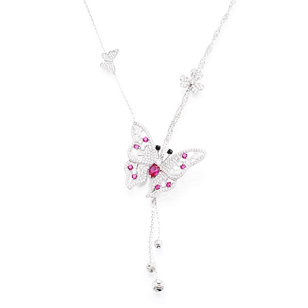 Dây chuyền AVJ.N000209.00 tiếp tục là một thiết kế nổi bật, phù hợp với không khí của những buổi tiệc. Dây chuyền có mặt hình cánh bướm, đính đá 2 màu trắng và hồng, kết hợp thêm 1 cánh bướm nhỏ và 1 bông hoa đặt ở hai bên.