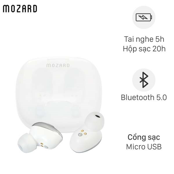 Tai nghe Mozard AT15 | Thời gian tai nghe: Dùng 5 giờ - Sạc 1.5 giờ. Thời gian hộp sạc: Dùng 32 giờ - Sạc 1.5 giờ. Tiện ích: Chống nước IPX4, có mic thoại, Sử dụng độc lập 1 bên tai nghe, đệm tai đi kèm. Hỗ trợ kết nối: Bluetooth 5.0. | Trắng, đen | 800.000 VNĐ |