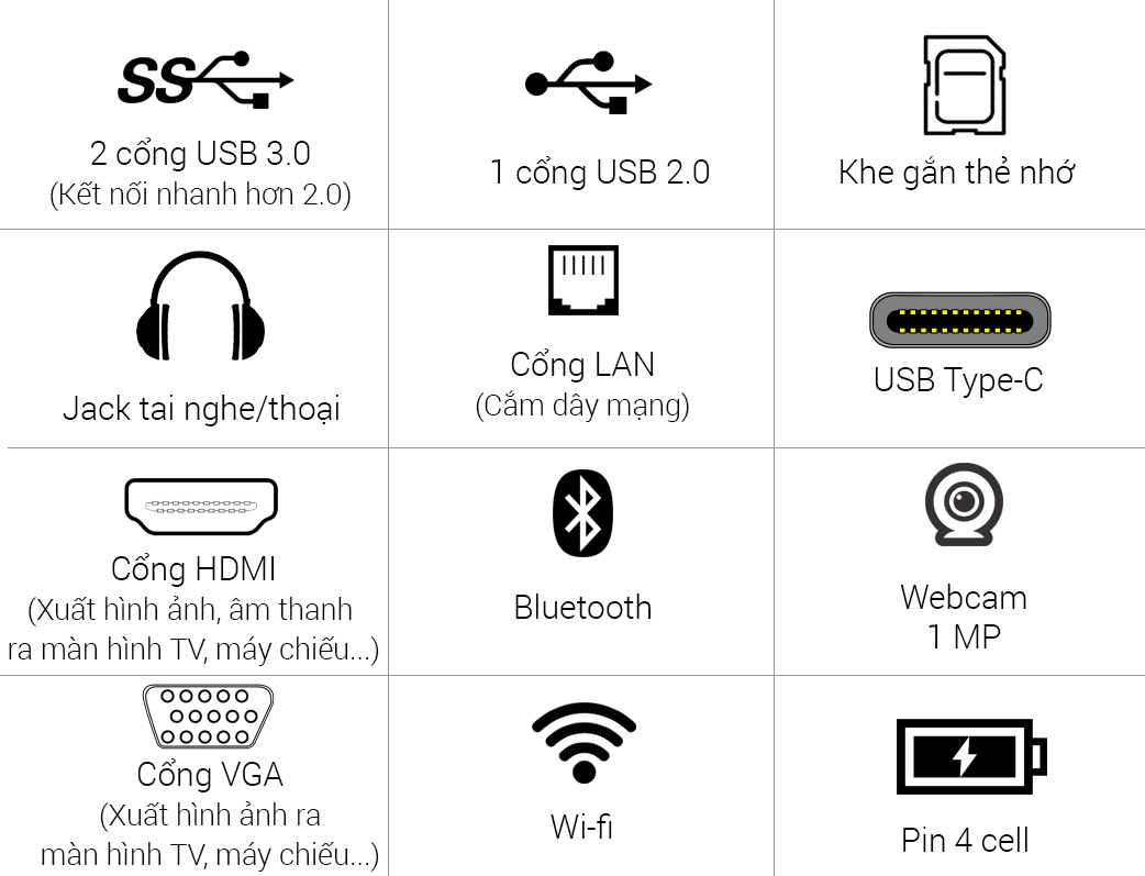 Máy hỗ trợ đầy đủ các cổng kết nối chuẩn mới hiện nay, nên việc chia sẻ hoặc trình chiếu rất tiện lợi.