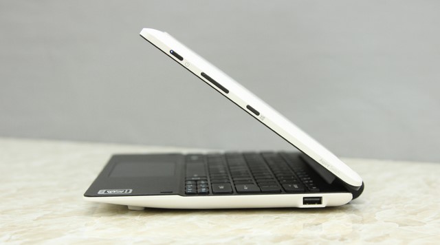 Cạnh trái của máy có cổng USB ở thân máy, nắp máy có nút nguồn, âm lượng và ô cửa sổ Windows