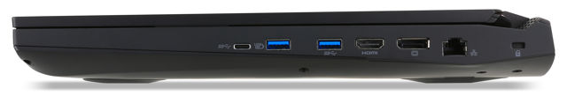 Bên phải có cổng USB Type-C, 2 cổng USB 3.0, cổng HDMI, Display port và cổng LAN dùng card Killer DoubleShot Pro cho kết nối Ethernet và Wifi mạnh hơn, ổn định hơn.