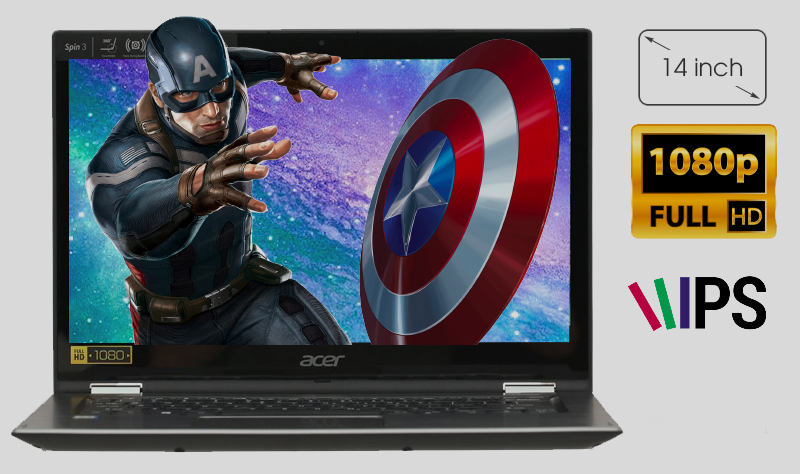 Laptop Acer Spin 3 SP314 sở hữu màn hình 14 inch nhỏ gọn, độ phân giải Full HD cùng tấm nền IPS mang lại khả năng hiển thị màu sắc tuyệt vời khi xem nhiều góc độ khác nhau.