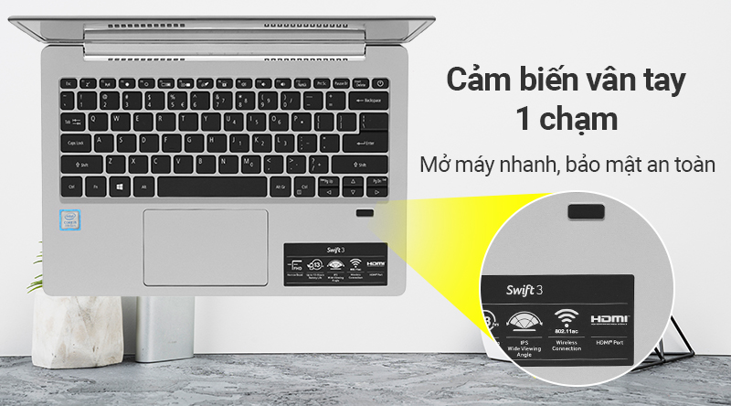 Laptop Acer Swift 3 SF313 51 56UW trang bị hệ thống bảo mật vân tay giúp việc đăng nhập dễ dàng hơn chỉ bằng một lần chạm mà không làm giảm khả năng bảo mật.