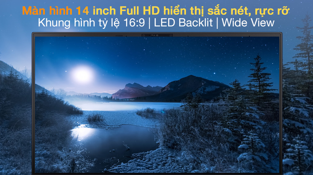 Màn hình 14 inch viền mỏng sở hữu độ phân giải Full HD (1920 x 1080) mang đến những trải nghiệm chân thật, rõ nét, đắm chìm trong thế giới ảo ở bất kỳ không gian nào có ánh sáng không quá gắt nhờ độ sáng màn hình 400 nits.