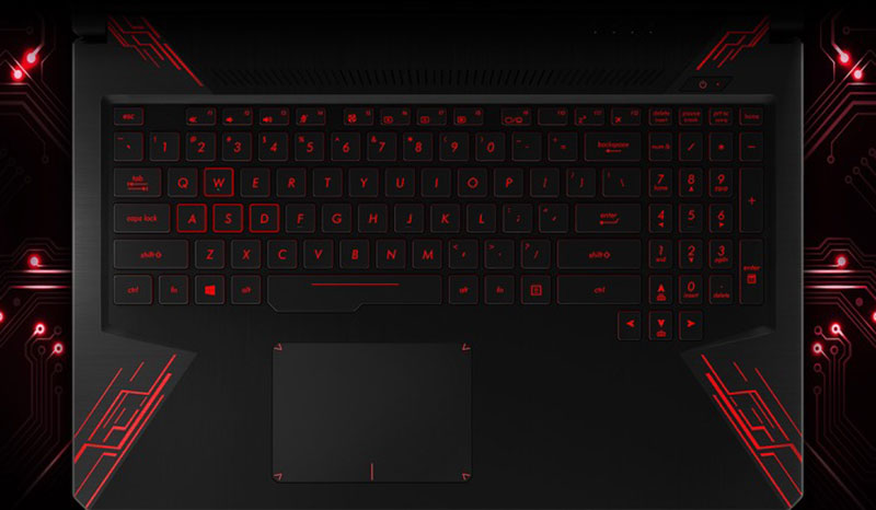 Bàn phím của Asus FX504GD được lấy ý tưởng từ máy tính để bàn có thiết kế rất hoàn hảo và bền bỉ. Các phím được bố trí gọn gàng, hành trình phím hợp lý giúp cho việc thao tác nhạy hơn và thoải mái hơn, ngoài ra bàn phím còn có đèn nền rất hữu ích cho người chơi game hoặc làm việc trong bóng tối. Công nghệ Overstroke độc quyền đảm bảo cho thao tác phím chính xác hơn. Cụm phím WASD nổi bật, phím space rộng, các phím mũi tên được tách rời giúp thao tác gõ phím không bị nhầm lẫn.