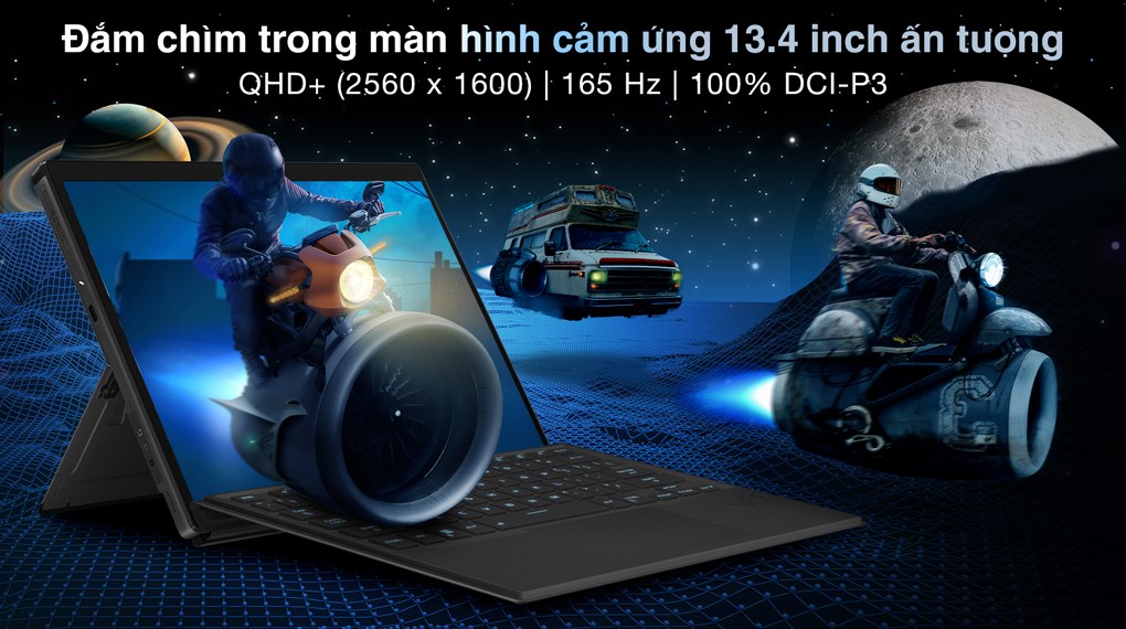 Laptop Asus ROG được trang bị màn hình 13.4 inch, mang đến trải nghiệm hình ảnh tuyệt đẹp và sắc nét với độ phân giải QHD+ (2560 x 1600) cùng tỷ lệ khung hình 16:10, đảm bảo hình ảnh luôn hiển thị rõ ràng, chi tiết cùng màu sắc sống động.