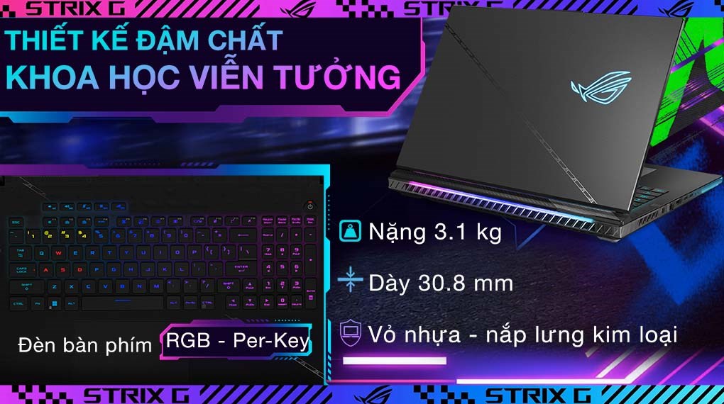 Laptop Asus được thiết kế với vỏ nhựa và nắp lưng bằng kim loại màu đen, tăng thêm độ đẳng cấp và mạnh mẽ với các dải LED được setup quanh thân máy. Đèn chuyển màu RGB - Per-Key cho phép người dùng tùy chỉnh màu sắc và cấu hình đèn nền của từng phím trên máy để tăng cường cảm giác chơi game và làm việc trên thiết bị.