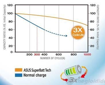 Với công nghệ độc quyền ASUS SuperBatt, các module IC sạc thông minh trên ASUS tự động điều chỉnh điện áp phù hợp nhất vì vậy tuổi thọ pin sẽ được tăng cường lên gấp 3 lần, tốc độc sạc pin nhanh hơn 15% so với các loại máy tính xách tay bình thường.