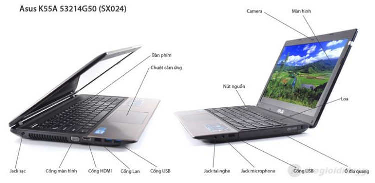 K55A có đầy đủ các kết nối cần thiết trên một laptop thông thường: 2 cổng USB 3.0, LAN (RJ45), USB 2.0, VGA (D-Sub), HDMI, cổng audio 3.5mm, camera, microphone,…