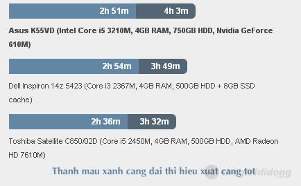 Thử nghiệm hàng giờ sử dụng với các dòng khác thương hiệu như: Toshiba Satellite C850 và Dell Inspiron 14Z. Asus K55VD cho hiệu suất dùng pin liên tục với Full tải là 2 giờ 51 phút và độ sáng màn hình ở mức trung bình là 4 giờ 3 phút. Một hiệu xuất chấp nhận được với dòng đồ họa rời.