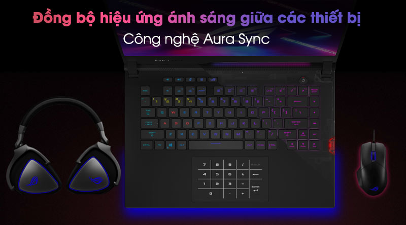 Bàn phím được thiết kế rộng rãi, hành trình phím phù hợp với game thủ. Bàn phím còn được trang bị đèn nền chuyển màu RGB là một đặc trưng nổi bật trên dòng Asus Rog, bạn hoàn toàn có thể tùy chỉnh màu bàn phím theo ý muốn của mình, vừa nổi bật vừa hợp ý. Kết hợp cùng đèn bàn phím để tạo thêm điểm nhấn cho chiếc laptop này là thanh ánh sáng Aura Sync bao quanh thân máy khá là nổi bật.