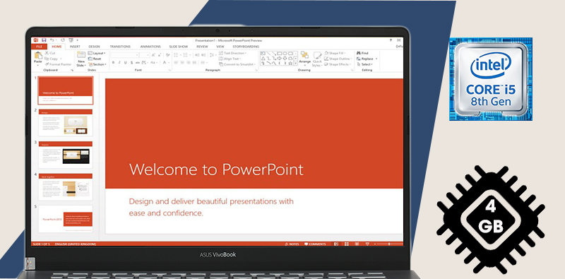 Được trang bị bộ vi xử lý Intel Core i5 thế hệ thứ 8 cùng 4 GB RAM đem lại cho máy một sức mạnh xử lý ổn định với các ứng dụng văn phòng và đồ họa bằng Photoshop, tiết kiệm điện năng hiệu quả.