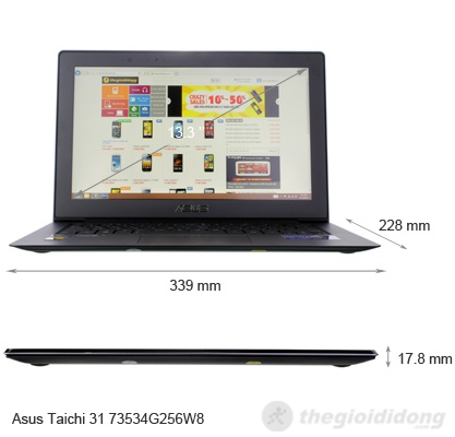 Asus Taichi 31 73534G256W8 có sự đầu tư kỹ lưỡng về mặt thiết kế, bởi bề ngoài có thân hình quá mỏng, nhưng lại đảm nhận đến hai chiếc màn hình ở hai bên với cơ chế hoạt động và chuyển đổi linh hoạt. Taichi 31 sẽ khiến bạn ngạc nhiên bởi độ mỏng và trọng lượng của nó, với kích thước 339 x 228 x 17.8 mm và chỉ nặng 1.56 kg, với trọng lượng này bạn hoàn toàn có thể cầm bằng một tay dễ dàng.