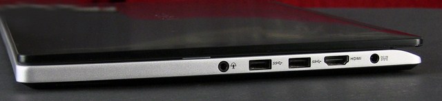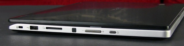 Khác với những chiếc laptop khác, Asus TP300LA có nút nguồn được bố trí ở cạnh trái của máy ngay gần với nút tăng giảm âm lượng và nút Windows. Ngoài ra trên cạnh máy còn hỗ trợ cổng HDMI, cổng USB, jack audio cùng khe cắm thẻ nhớ, không hỗ trợ jack mạng LAN.