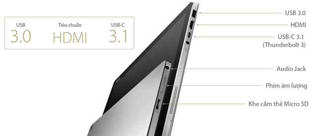 Asus Transformer Pro T304UA có đầy đủ các cổng kết nối chuẩn mới, hiện đại phục vụ tốt cho nhu cầu sử dụng. Nổi bật nhất có lẽ là cổng USB Type-C đang rất thịnh hành, cho tốc độ truyền tải dữ liệu cao và độ ổn định tốt.