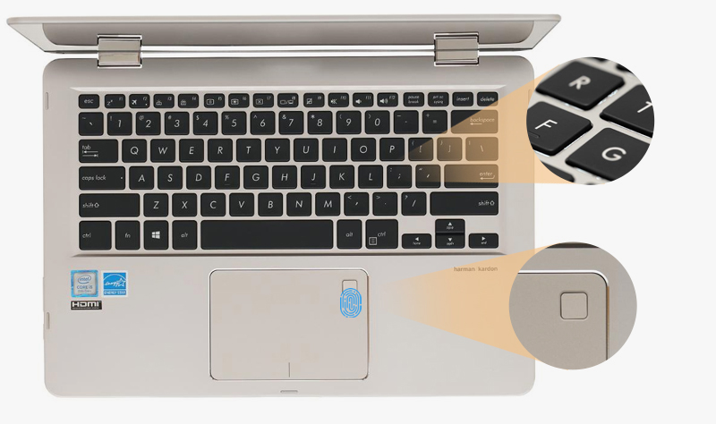 Bàn phím hỗ trợ đèn nền với 3 mức sáng, ánh sáng tỏa ra đều và dịu, dễ chịu khi sử dụng trong môi trường tối. Tính năng mở khóa bằng vân tay thường thấy trên Smartphone nay đã được Asus trang bị cho laptop. Tất cả những gì bạn cần làm để mở khóa là chạm tay, vô cùng nhanh chóng và tiện lợi.