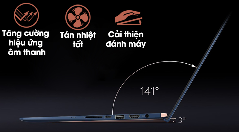 Laptop Asus Zenbook 15 thiết kế luôn hướng tới người dùng với bản lề ErgoLift nâng bàn phím 3 độ để phím đạt vị trí gõ thoải mái nhất, hỗ trợ khuếch tán âm thanh cũng như tản nhiệt tốt hơn.
