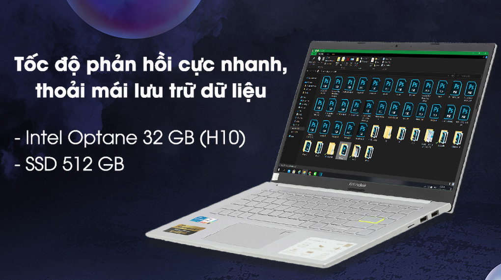 Ổ cứng SSD 512 GB NVMe PCIe kết hợp với Intel Optane 32GB (H10) cho tốc độ truy xuất dữ liệu nhanh vượt trội, mở máy và mở ứng dụng chỉ trong vài giây và mang lại kho lưu trữ vừa đủ để bạn lưu các tài liệu cần thiết cho công việc.