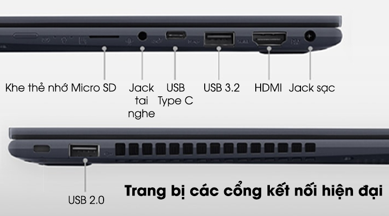 Bên cạnh đó, laptop Asus còn được trang bị vô cùng đầy đủ các cổng kết nối tiện dụng như USB 3.2, HDMI, USB 2.0, USB Type-C và đầu đọc thẻ nhớ Micro SD giúp bạn kết nối với tất cả các thiết bị ngoại vi, màn hình và máy chiếu hết sức nhanh chóng.