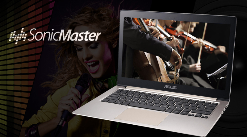 Tích hợp công nghệ ASUS SonicMaster mang đến không gian thưởng âm sống động, âm bass trầm ấm, âm giọng trong trẻo rõ ràng. Chất lượng âm thanh cao cấp nhờ sử dụng loa 1.5W với lõi âm hình ô van và nam châm cỡ lớn, kết hợp buồng loa cộng hưởng kích thước lớn và thiết kế khung nhôm của thân máy. Thêm vào đó, máy tích hợp phần mềm AudioWizard với nhiều thiết lập sẵn để bạn tận hưởng âm thanh khi nghe nhạc, xem phim, bài diễn văn, chơi game hay thu âm.