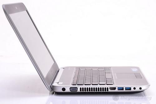 Cạnh trái với cổng nguồn, cổng kết nối projector, khe tản nhiệt, e-SATA, 2 cổng USB 3.0 và giắc cắm tai nghe, microphone 3.5 mm
