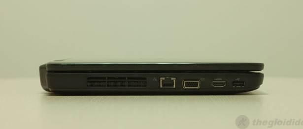 Cạnh trái máy có một khe tản nhiệt, khe cắm cổng LAN, kết nối HDMI và DSUB, cùng với một cổng USB 2.0.