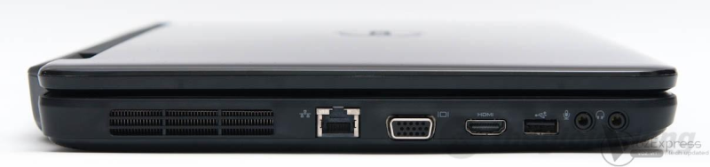 Cạnh trái bao gồm khe thoát nhiệt, cổng cắm cáp mạng RJ45, ngõ xuất tín hiệu ra màn chiếu hoặc màn hình phụ D-sub, cổng xuất tín hiệu hình ảnh chất lượng cao HDMI, cổng USB 2.0, jack cắm microphone và tai nghe.