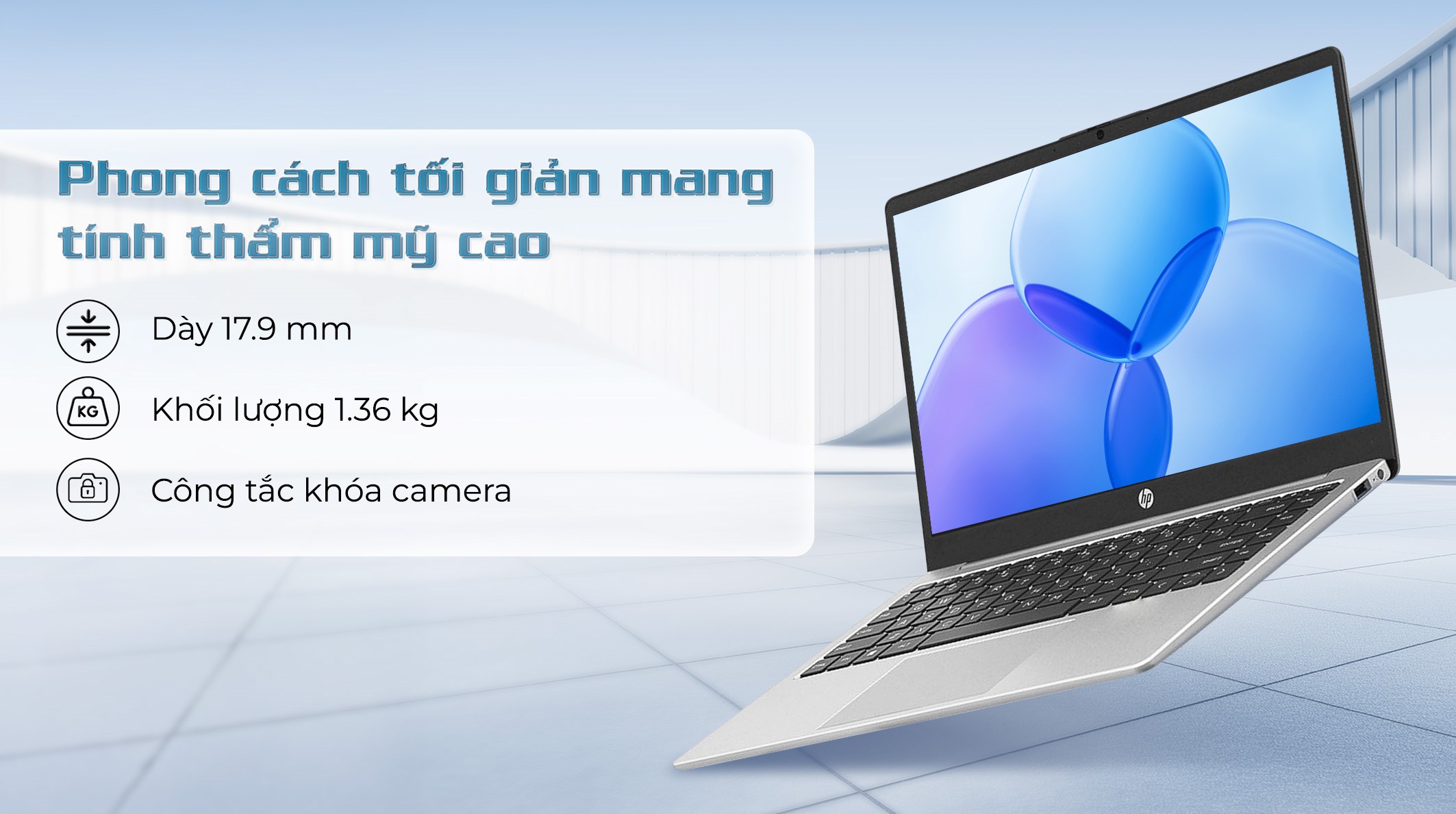 Laptop HP gây ấn tượng với thiết kế mỏng nhẹ, chỉ dày 17.9 mm và nặng 1.36 kg, rất tiện lợi để mang theo bên mình. Vỏ máy được làm từ chất liệu nhựa nhưng vẫn đảm bảo độ bền bỉ, chắc chắn. Bàn phím có hành trình phím vừa phải, độ nảy tốt, cho trải nghiệm gõ phím thoải mái. Touchpad rộng rãi, nhạy bén, hỗ trợ đa điểm chạm, giúp bạn thao tác dễ dàng. Đặc biệt, máy còn trang bị công tắc khóa camera, giúp bảo vệ sự riêng tư của người dùng.