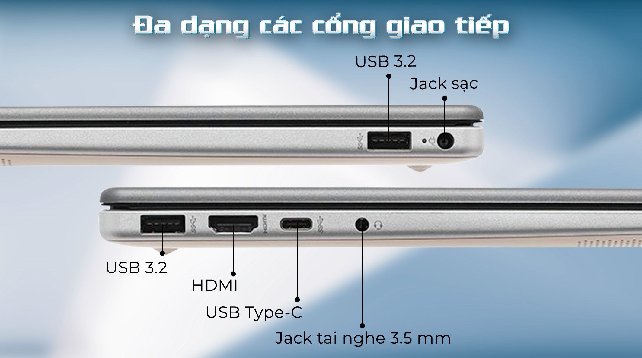 Máy được trang bị đầy đủ các cổng kết nối cần thiết như 2 cổng USB 3.2, cổng HDMI, cổng Headphone/microphone combo và cổng USB Type-C, giúp bạn dễ dàng kết nối với các thiết bị ngoại vi. Kết nối không dây Wi-Fi 6 (802.11ax) và Bluetooth 5.3 cho tốc độ truyền tải dữ liệu nhanh chóng và ổn định. Pin 3-cell 41 Wh cho thời lượng sử dụng khá tốt, đủ để bạn làm việc và giải trí trong khoảng 5-6 tiếng liên tục.